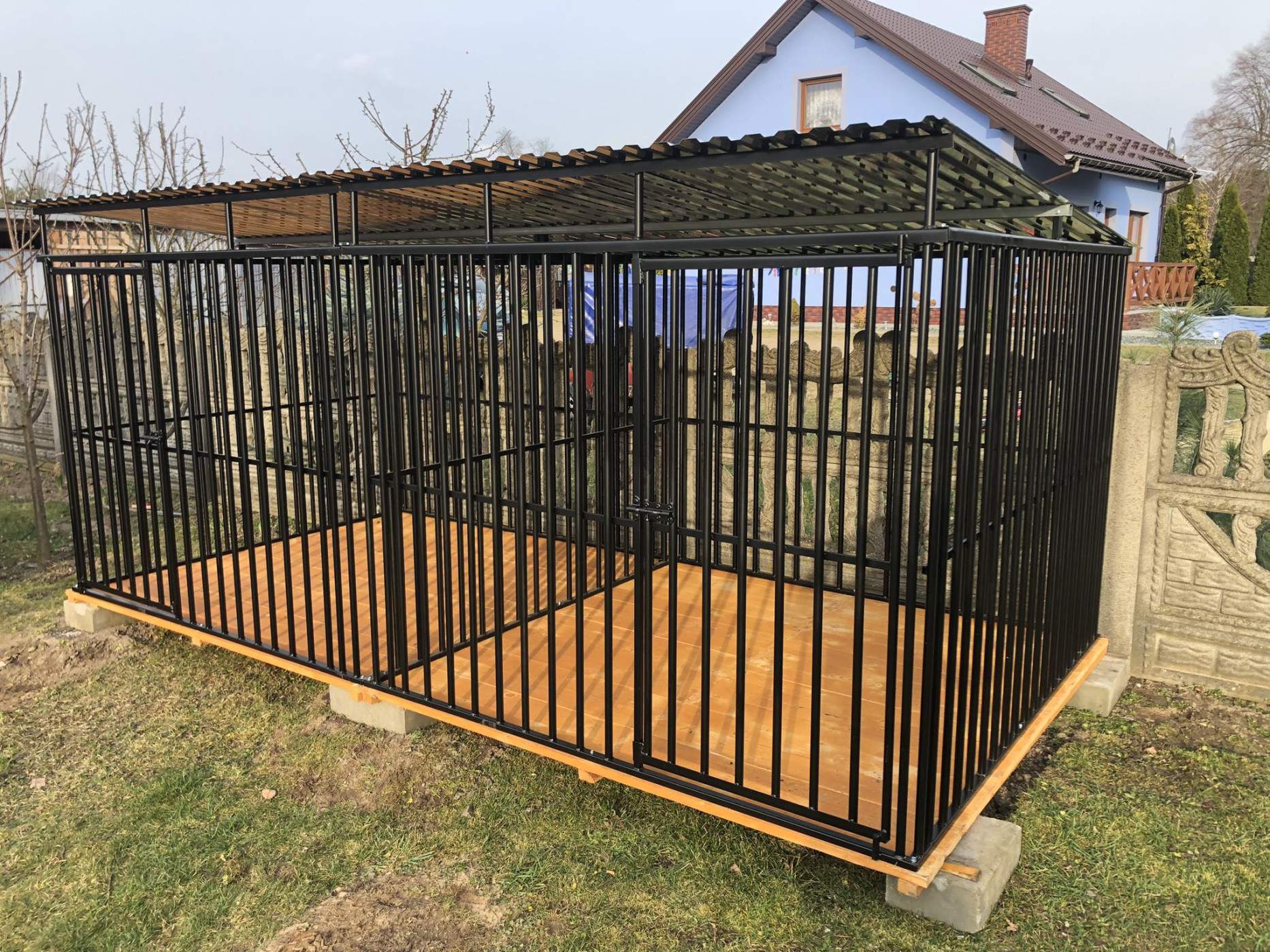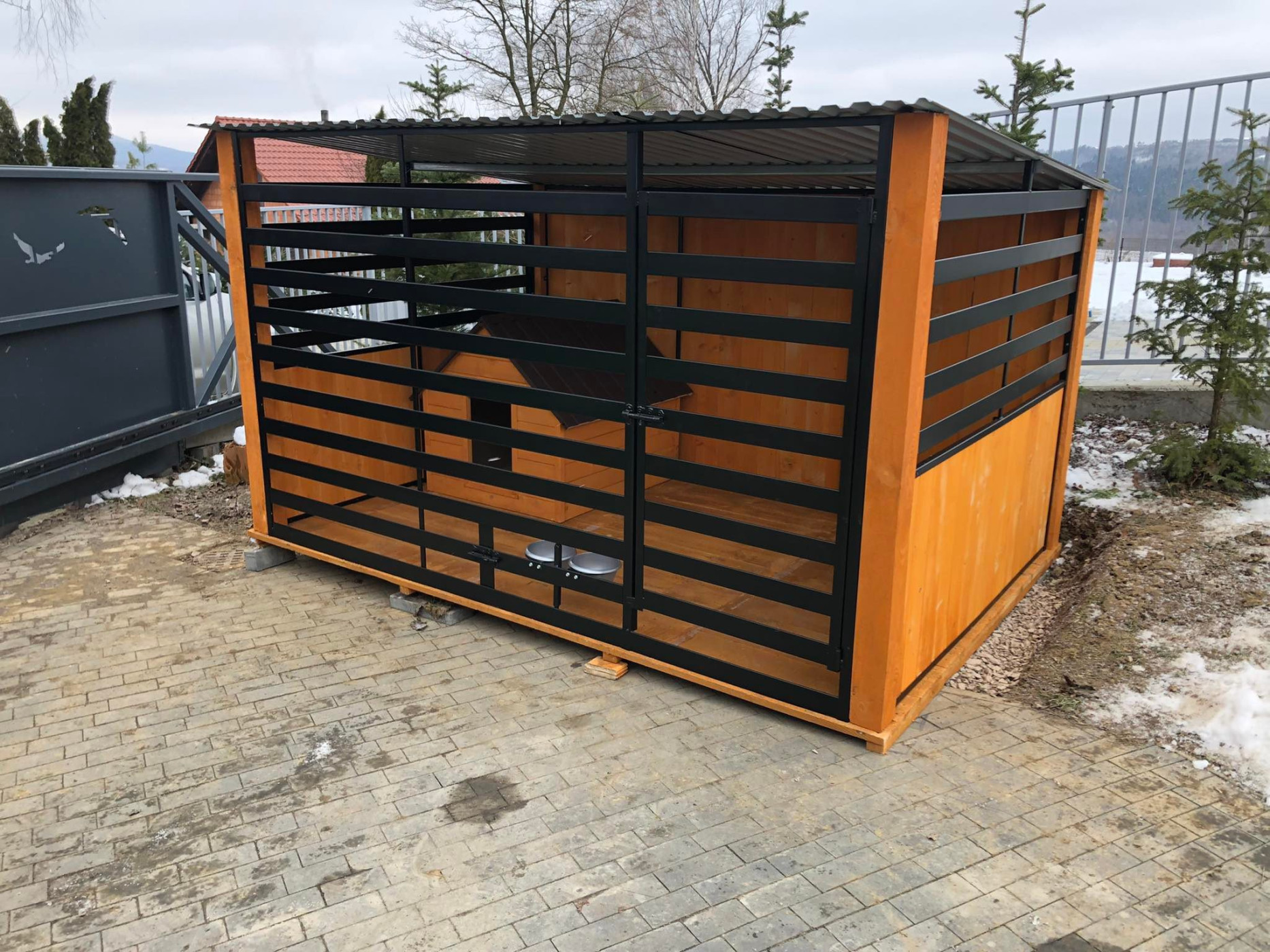Voliéry série BLACK LINE s dreveným dizajnom a oceľovými trubkami kombinujú prírodný vzhľad s robustnosťou, vytvárajúc elegantné a odolné prostredie pre psov na ich príjemný pobyt pobyt.